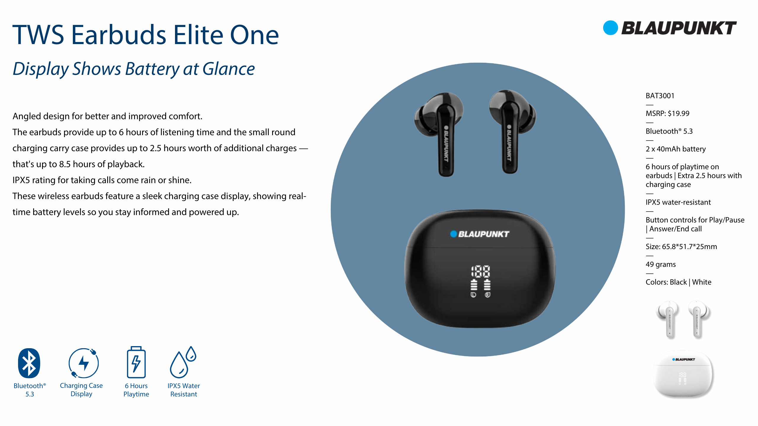 Bluetooth® 5.3 | 2 x 40mAh battery